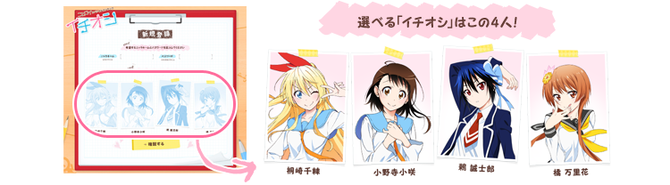 『ニセコイ』に登場する「桐崎千棘」「小野寺小咲」「鶫誠士郎」「橘万里花」ら、4人のヒロインから、1人あなたの一番好きなヒロイン「イチオシ」を選んで、その「イチオシ」をひたすら"オウエン"していくコンテンツです。